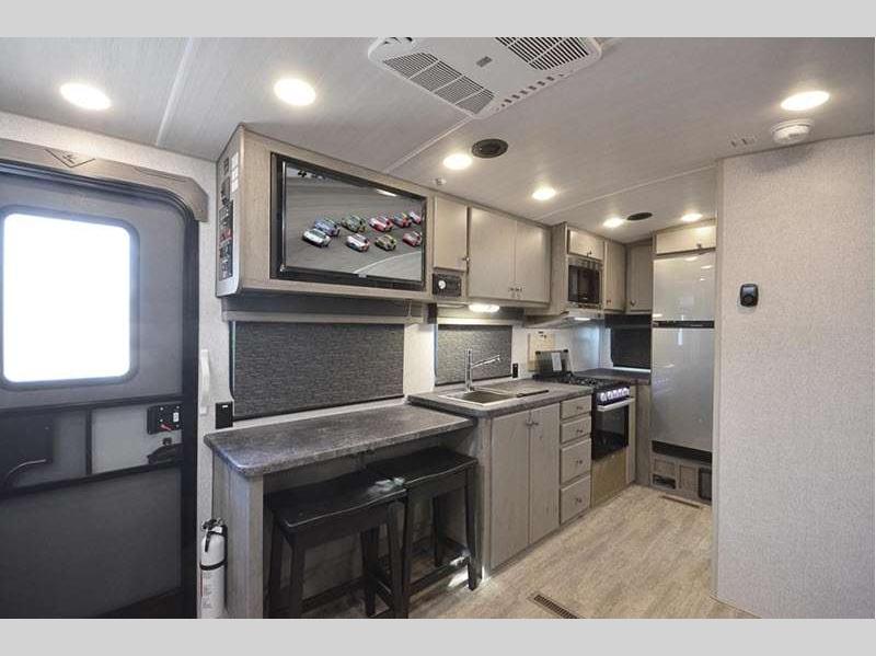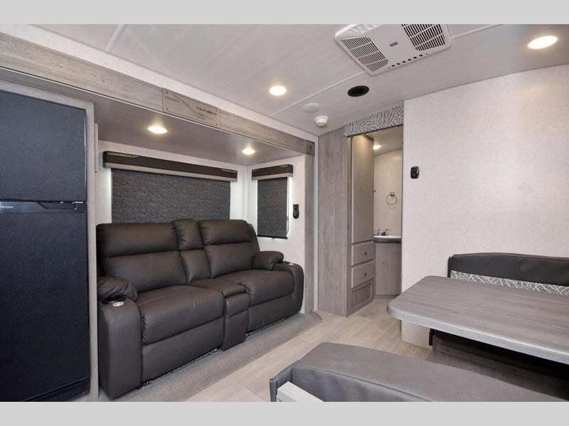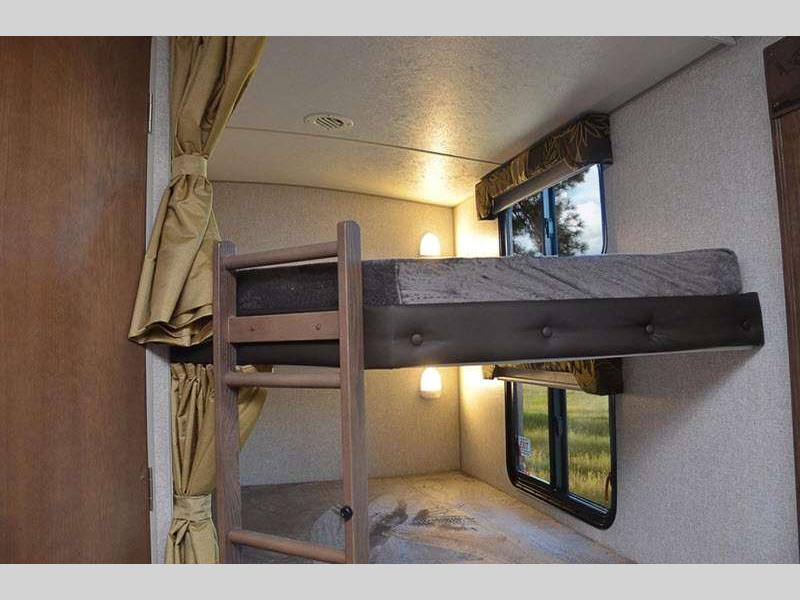 Sleeps 7 Slides 1 Length 28 ft 8 in Ext Width 8 ft Ext Height 11 ft 6 in Interior Color Desert Palms, Solitaire Azul Hitch Weight 758 lbs GVWR 9200 lbs Dry Weight 6460 lbs Cargo Capacity 2740 lbs Fresh Water Capacity 50 gals Grey Water Capacity 42 gals Black Water Capacity 35 gals Tire Size ST235/80R16 Furnace BTU 25000 btu Number Of Bunks 2 Available Beds RV Queen Refrigerator Type 12V Refrigerator Size 10 cu ft Cooktop Burners 3 Number of Awnings 1 Axle Weight 5702 lbs LP Tank Capacity 60 lbs Water Heater Capacity 10 gal Water Heater Type DSI Gas/Electric Quick Recovery AC BTU 13500 btu Awning Info 16' 12V LED w/Adjustable Pitch Axle Count 2 Shower Type Tub/Shower Combo Solar Wattage 400 watts Similar Floorplans